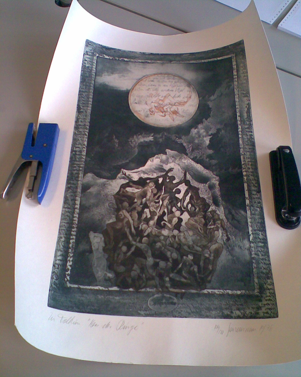 Ich habe zwei Kunstdrucke bekommen. Die Drucke sind auf stabilem Pergamentpapier und auf BEIDEN steht die Jahreszahl 1978 mit Bleistift drauf. Es handelt sich hierbei um Drucke zu Tolkien's "Herr Der Ringe"-Saga.
